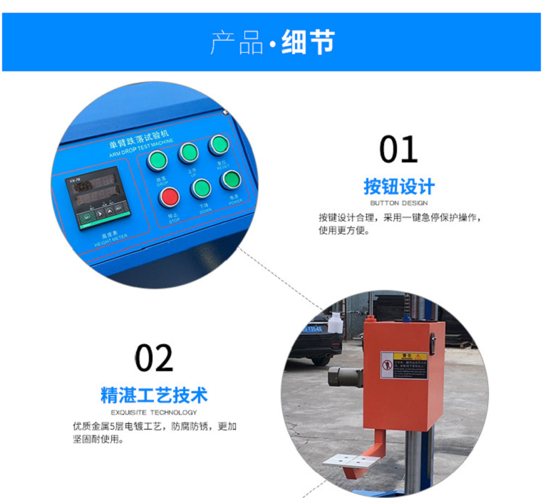 單臂跌落試驗機可對包裝件的面、角、棱作自由跌落試驗,配備數顯高度顯示儀及采用譯碼器進行高度跟蹤,從而能精確地給出產品跌落高度,與預設跌落高度誤差不超過2%或10MM。本機采用單臂雙柱結構,具有電動復位、電控跌落及電動升降裝置,使用方便;獨有的緩沖裝置大大的提高了機器使用壽命、平穩性及安全性。單臂設置,可方便地放置產品。