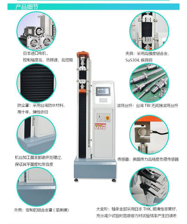 電子式拉力試驗機用途:用于橡膠、塑料、電線電纜、紡織物、防水材料、無紡布等非金屬材料及金屬絲、金屬箔、金屬板材和金屬棒的力學性能試驗,配合專用夾具亦適用于各種成品拉伸、壓縮、剝離、剪切、撕裂試驗,用以判定產品的質量。