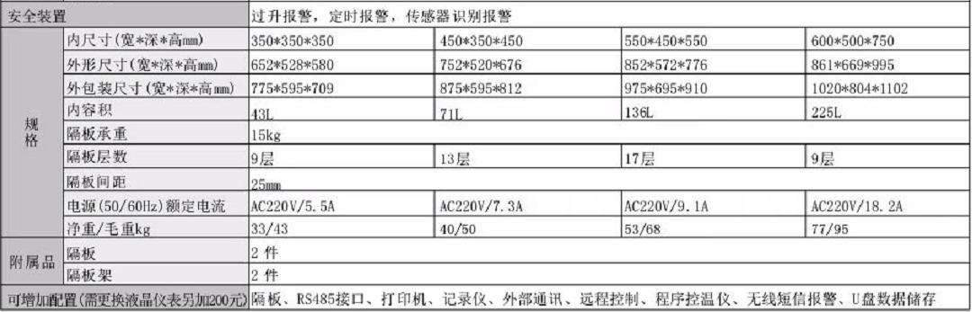 2.使用溫度范圍RT+10~250℃,溫度分布±2.5%,內(nèi)容積43L、71L、136L、225L